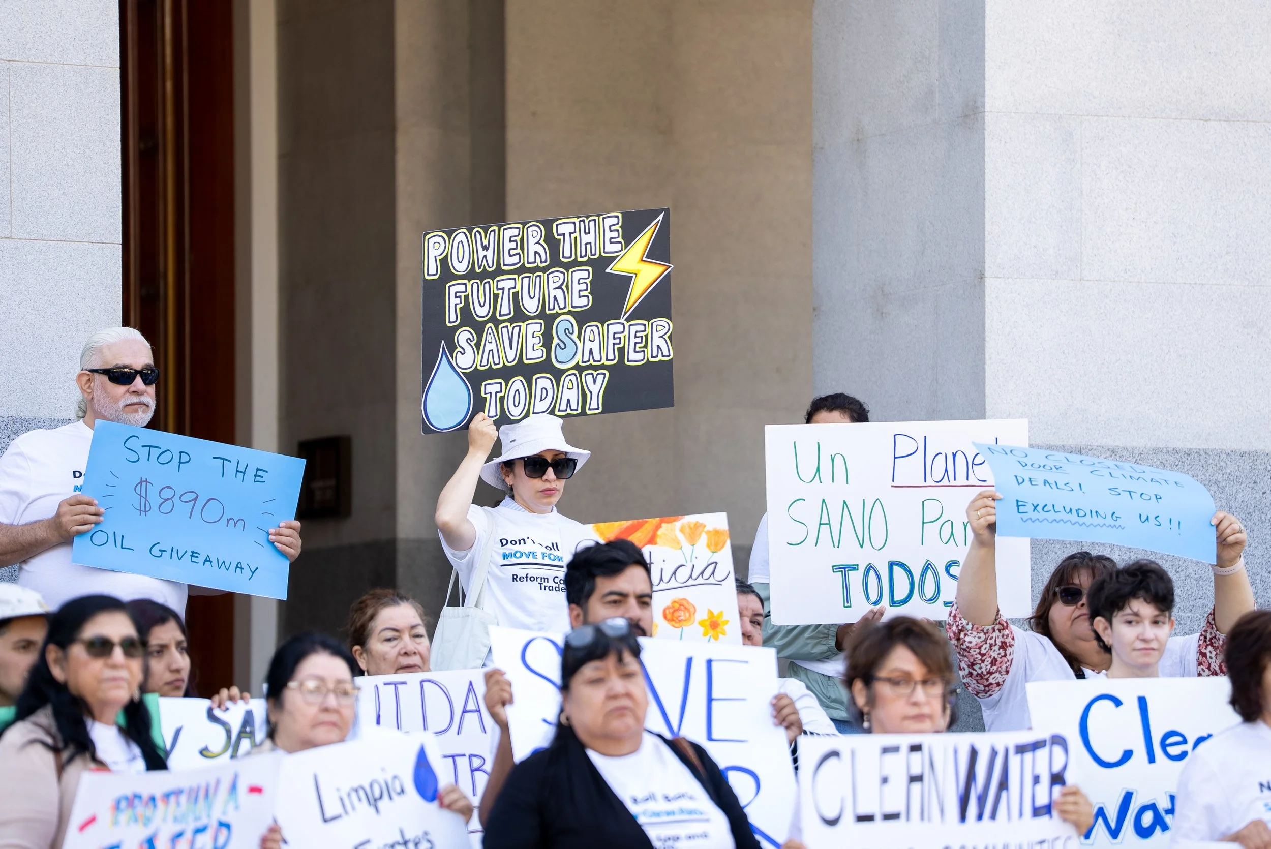 Estamos trabajando con la Legislatura de California para extender SAFER más allá de 2030 y reautorizar su fuente de financiamiento, el programa de Comercio de Emisiones. Casi 30 socios comunitarios del Valle Central y la Costa Central estuvieron en Sacramento compartiendo este mensaje. Los residentes fueron claros: necesitamos que el programa de Comercio de Emisiones invierta en nuestras comunidades y aumente la financiación disponible para programas climáticos como SAFER. SAFER suministra agua potable sana a escuelas y familias de todo el estado, proporcionando agua embotellada y trabajando para conectar a las comunidades con soluciones a largo plazo. Los residentes apoyan SAFER, compartiendo que dependen del agua embotellada porque el agua de la llave está contaminada y que necesitan las inversiones para hacer realidad el Derecho Humano al Agua.
